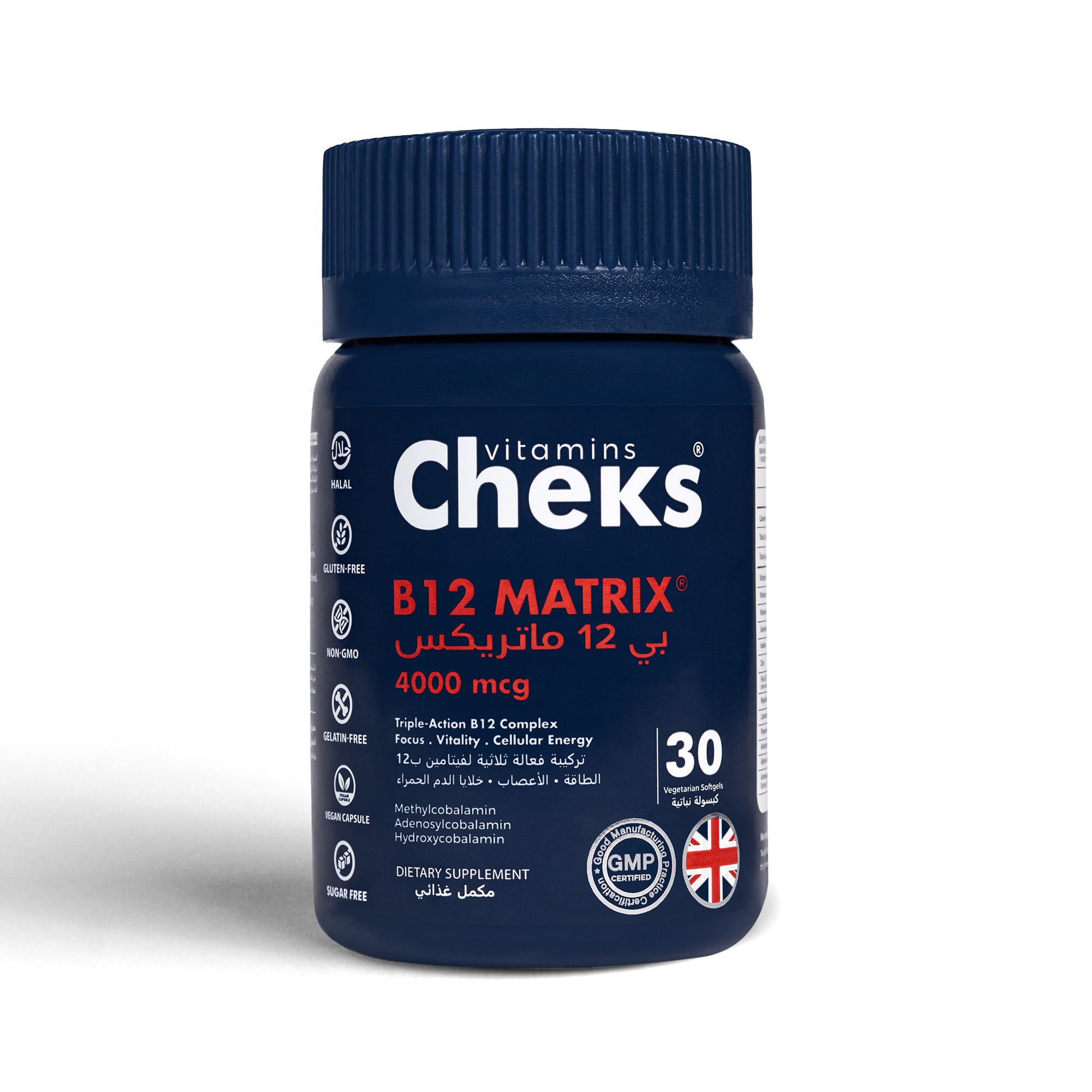 CHEKS B12 MATRIX® est un complément nutritionnel hautement dosé et technologiquement différenciant, reposant sur une association synergique de trois formes biologiquement actives de vitamine B12, couvrant l’ensemble des besoins métaboliques :